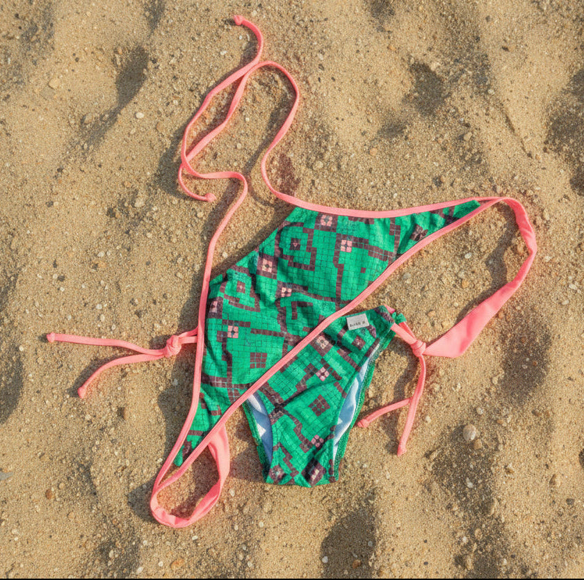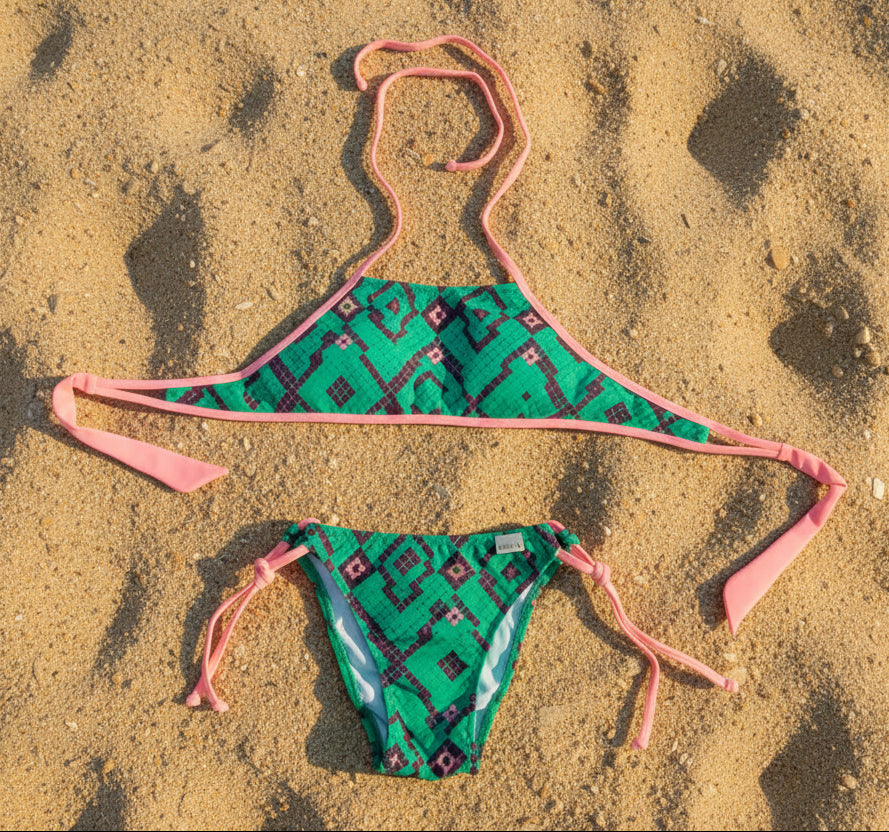 La braguita es ajustable con lazadas en los laterales y vivo a contraste,